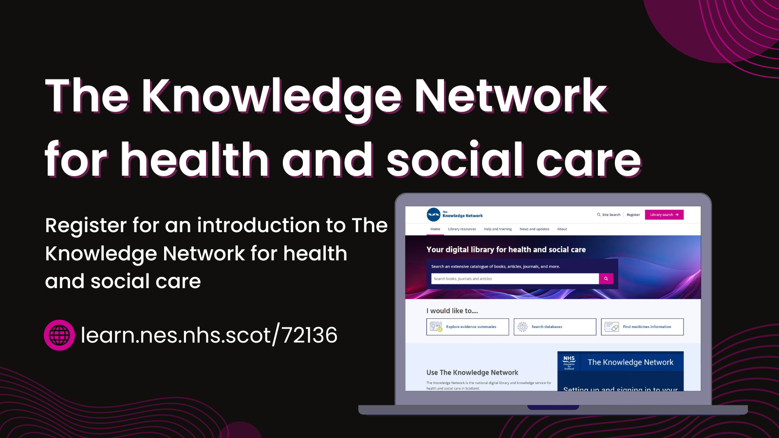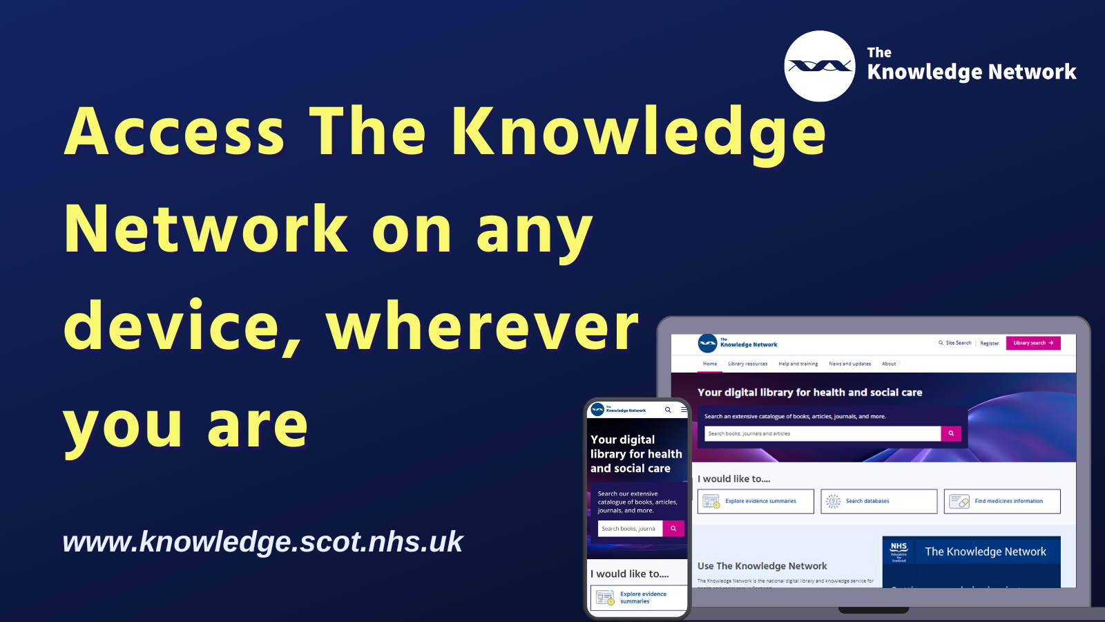 The Knowledge Network provides free access for health and care staff to a wide range of evidence summaries, journals, books, and databases via the Knowledge Network. Access online from anywhere, at any time and on any device: www.knowledge.scot.nhs.uk